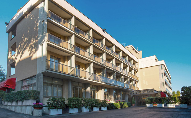 Moderno e raffinato hotel 4 stelle situato nei pressi dell’Eur, della Nuova Fiera di Roma, del centro Palalottomatica e a breve distanza dall’Aeroporto di Fiumicino. 215 camere e suite (di cui 26 camere comunicanti e 12 per disabili), dotate di aria condizionata, free WiFi, TV LCD sat, cassaforte e minibar. Il servizio navetta gratuito, disponibile 7/7 a orari prestabiliti, collega l’hotel con l’aeroporto e con la stazione della metropolitana Eur Fermi, da cui è possibile raggiungere comodamente il centro città e le principali attrazioni turistiche. Ristorante De Gustibus aperto 7/7, cucina mediterranea. Bar Divinus, aperto 7/7, dalle 10:30 alle 24:00. Centro benessere con piscina, Aloe Spa e Sala Fitness. Ampio parcheggio privato gratuito e parcheggio autobus.